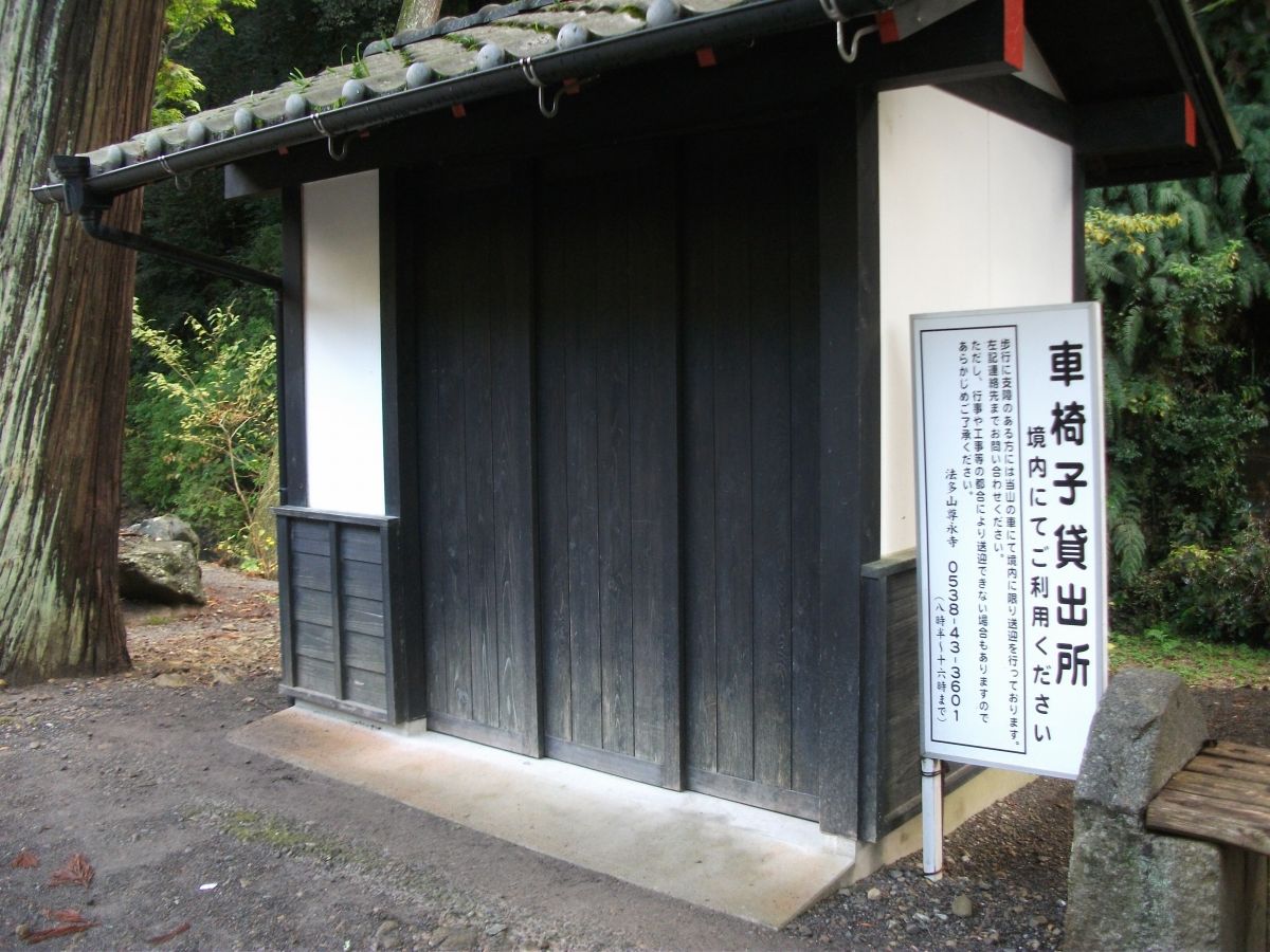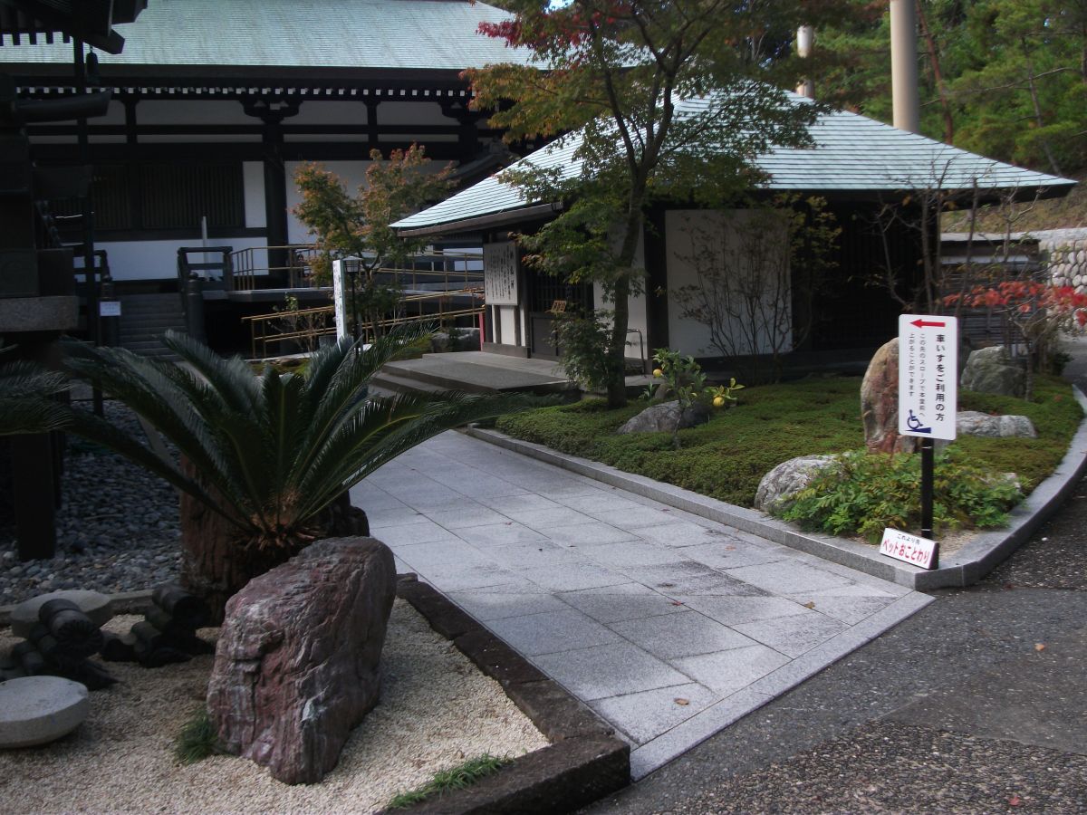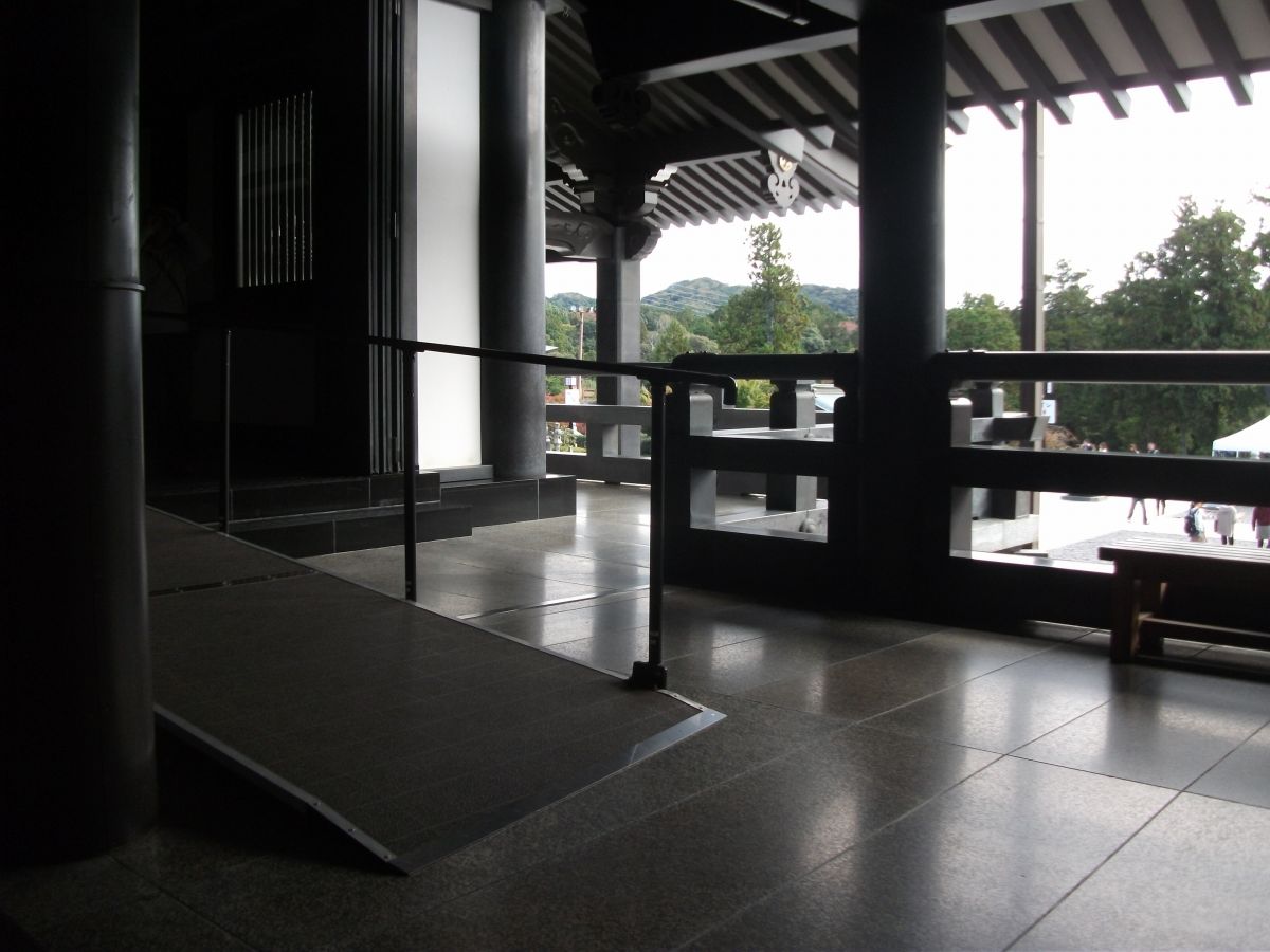 一方、境内の参道の多くの部分は、石畳やインターロッキングブロック、アスファルトで舗装され、車椅子でも移動はしやすい。もとより山地に位置するので参道の途中には石段も多いが、各所に石段を迂回できるスロープが整備されているほか、身障者用トイレや車椅子貸出所も設置されている。